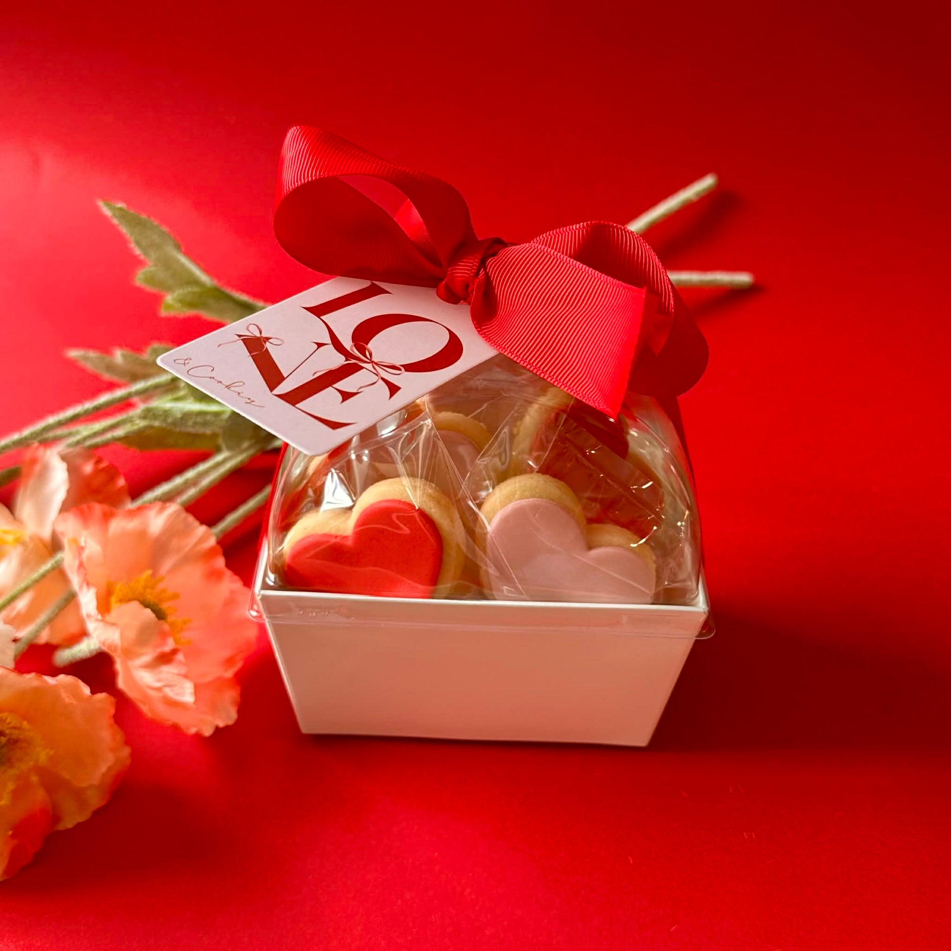 Designed to be gifted, our Valentine’s Day dome box features 12 mini heart-shaped sugar cookies in timeless reds and soft pinks, carefully arranged and finished with a red ribbon bow for a ready-to-give gift.